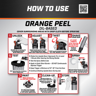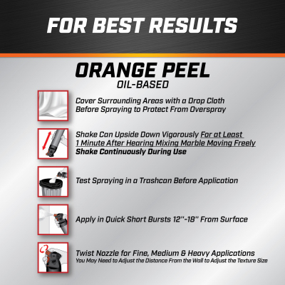 2in1 Wall & Ceiling Spray Texture Orange Peel Oil Based is an innovative technology system that allows you to tackle wall, ceiling & hard to reach areas with just one can. The Aim Tech adjustable nozzle can be easily rotated upwards to spray at almost any angle achieving maximum coverage. Its ergonomic system provides professional hopper results and ultimate spray control. The aerosol can is extremely easy to use, offers a wide fan for even coverage without excessive dripping or clogging. Proven to create a seamless blend with existing textured surfaces by adjusting the texture size to your desired finish. Fast dry time of 5 minutes. Superior paintability; no priming needed and won't soften or drag. Interior/Exterior.
