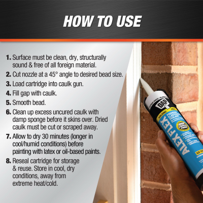 DAP ALEX FLEX PREMIUM MOLDING & TRIM ACRYLIC LATEX SEALANT is specifically formulated for use on molding and trim applications. It delivers excellent adhesion and flexibility for a crack proof seal. The high-performance formula is ideal for sealing natural and synthetic materials such wood, MDF, PVC, polystyrene and composite molding. It provides smooth and easy application and tooling, low odor, and water clean-up. In just 30 minutes, the sealant forms a tough outer skin that's dry enough to paint over with latex or oil-based paints, saving time. It provides a long-lasting, durable seal that will not shine through or discolor paint. ALEX FLEX is ideal for achieving a professional look with paint projects when sealing gaps around trim, crown molding, chair rails, baseboards, windows and doors. 60 Year. Exceeds ASTM Specification C920, Class 12.5. Interior/exterior use.