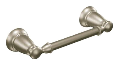 Moen Banbury Brushed Nickel Pivoting Toilet Paper Holder. A wall-mounted accessory crafted from durable zinc with a Spot Resist Brushed Nickel finish, this holder resists fingerprints and water spots, ensuring easy maintenance and lasting beauty. Its pivoting arm allows for convenient roll changes, while the classic design seamlessly complements traditional bathroom decors. Comes with mounting hardware for hassle-free installation.