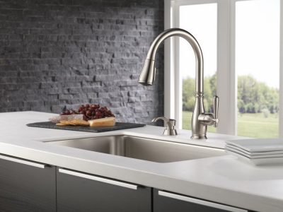 Delta Charmaine Stainless Finish Single-Handle Pull Down Kitchen Faucet with Soap Dispenser. Featuring Magnatite docking, it keeps the spray wand firmly in place with a powerful magnet. Diamond Seal technology ensures like-new operation for the faucet's lifetime, while Shield Spray technology cleans with laser-like precision, containing mess and splatter. Touch Clean spray holes allow for easy removal of hard water build-up. With a 360-degree swivel, this faucet offers maximum flexibility. Assembled Dimensions: 15-11/16"Hx11-3/4"Dx10-3/4"W.