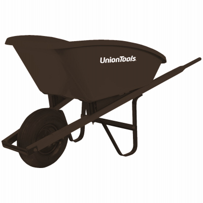 5 cuft, wheelbarrow has corrosion proof poly tray, recessed bolt holes, rib structure improves strength, hdpe material for all weather performance, flat front won't tip as easily when in storage, bolt retention in risers, double coated hardwood handles.